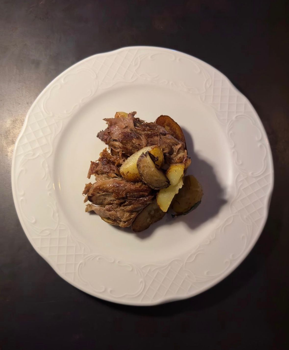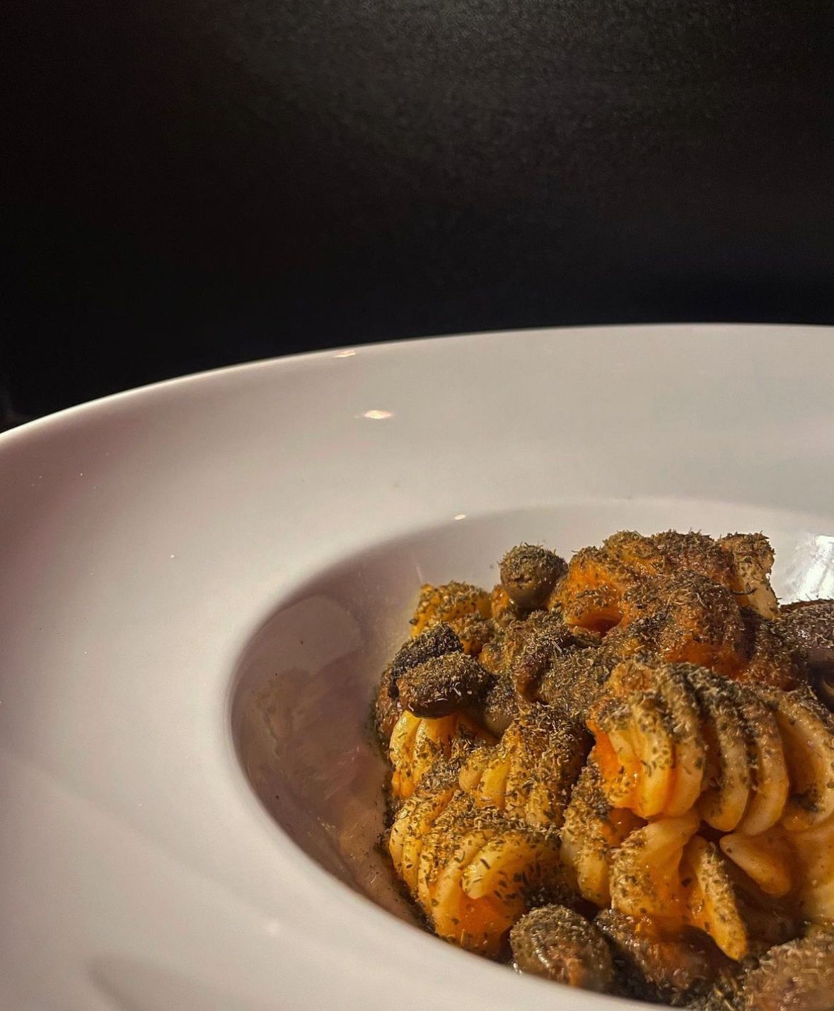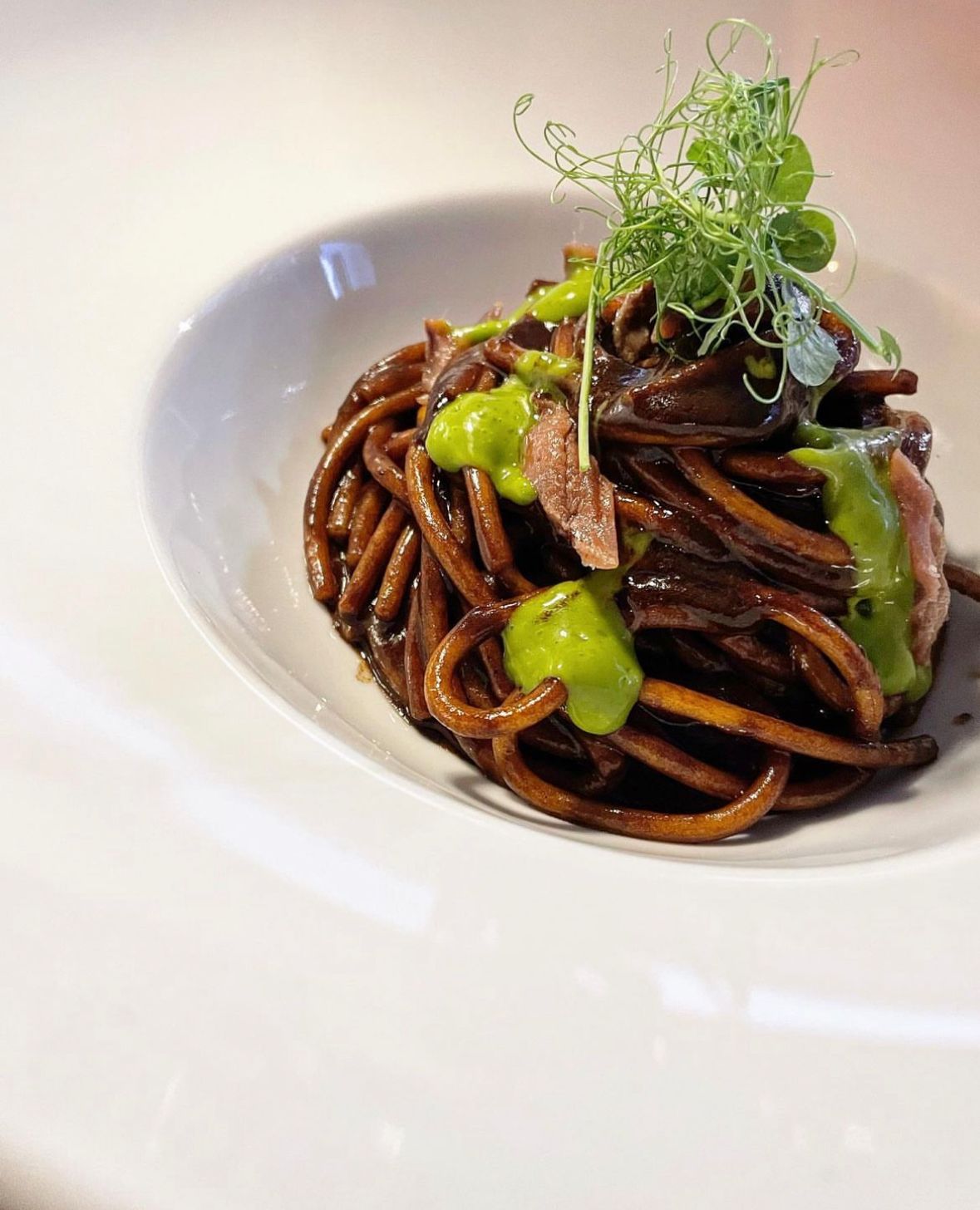 - Spaghettone, acciughe, aglio nero e prezzemolo