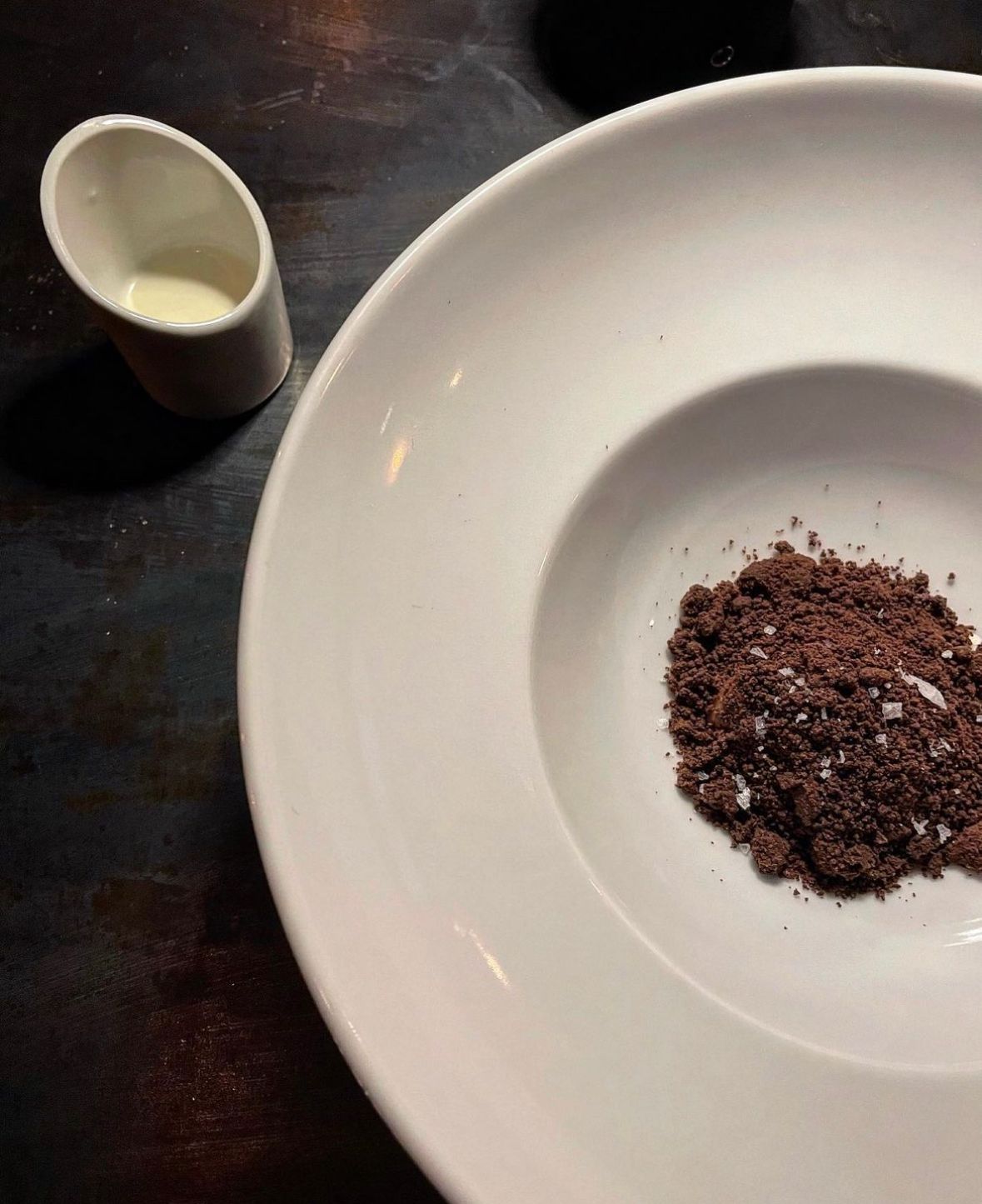 - Mousse fondente con crumble al cacao, salsa con vino bianco, alloro e rosmarino