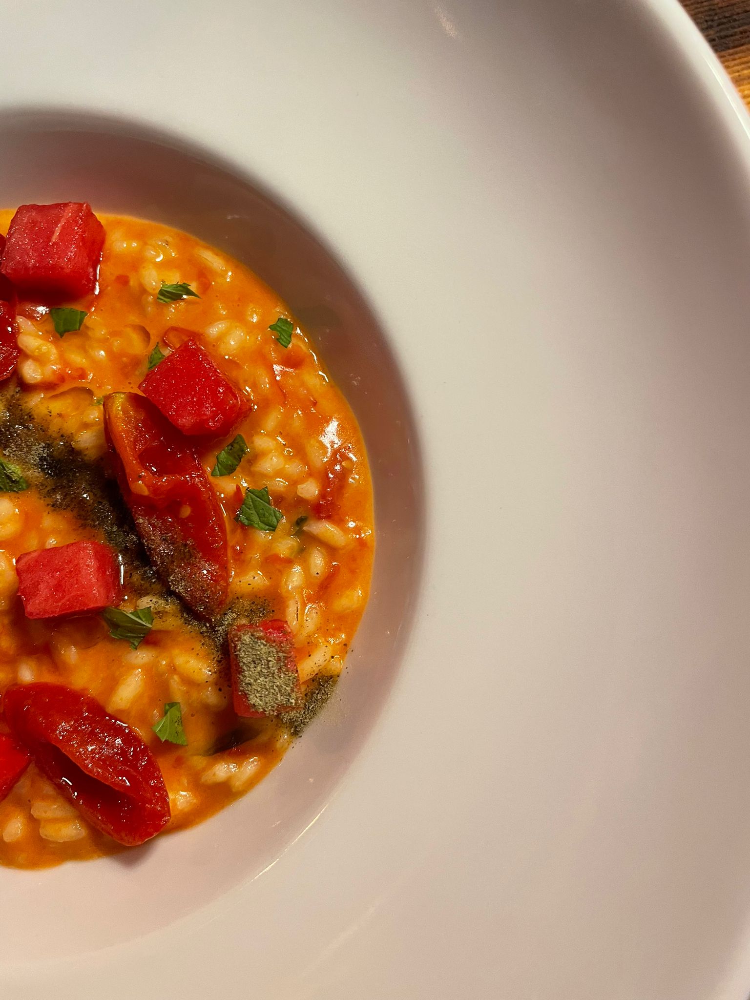 - Risotto, pomodorini, capperi, menta e anguria ghiacciata