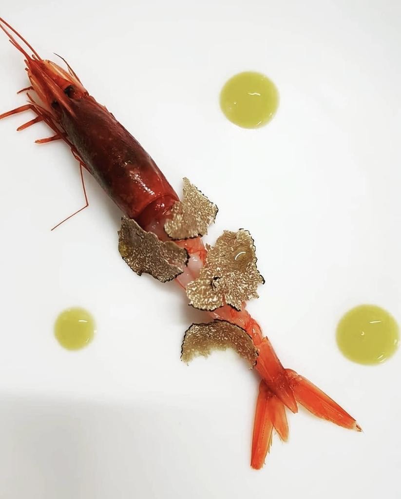 - Gambero rosso di Mazara, gel di arancia e tartufo