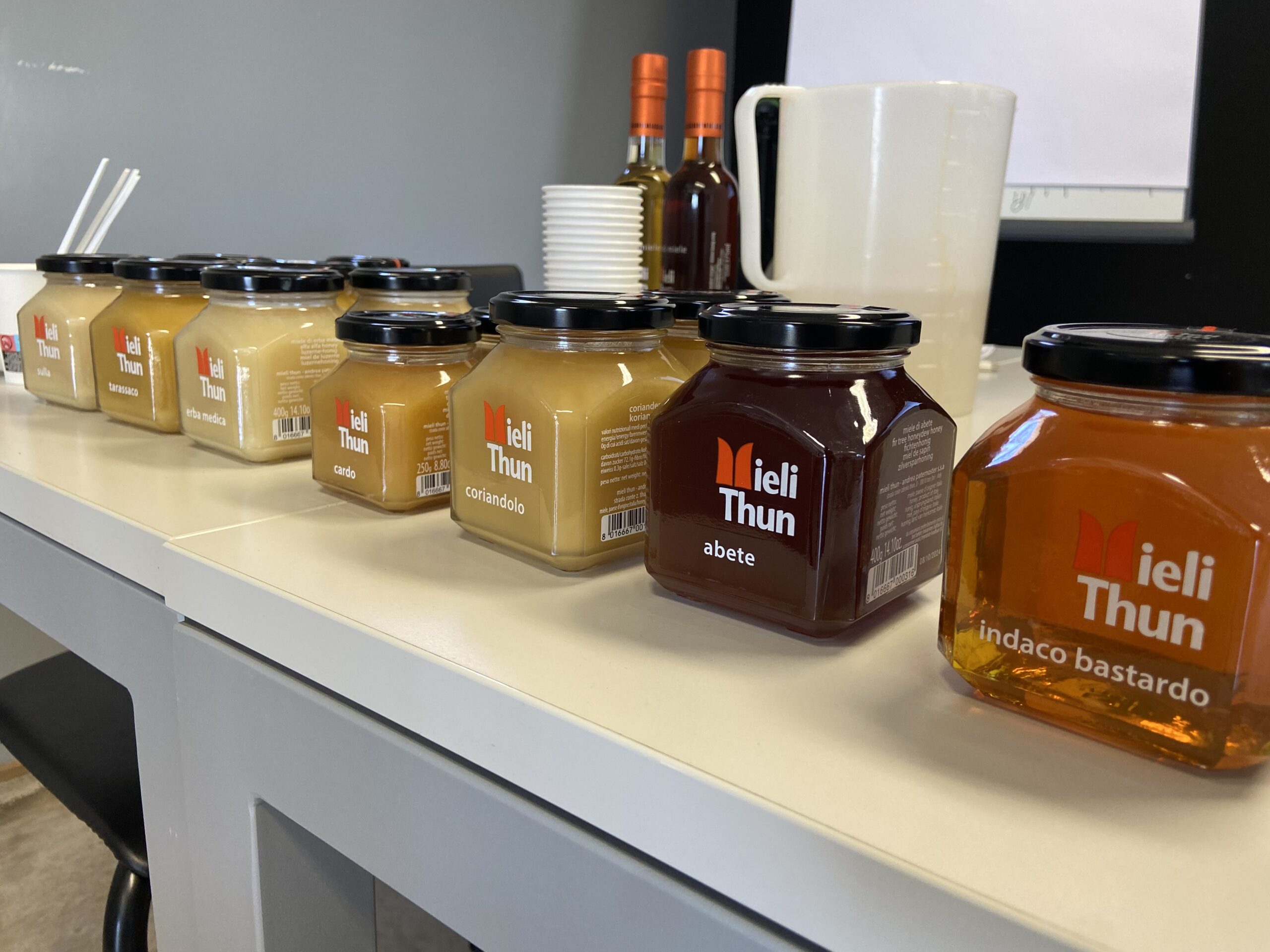 Dopo una breve introduzione sulla storia, sulla “coltura” delle api e sulla produzione del miele, la giovane apicultrice – con la collaborazione dell’esperta Elisia Menduni – ha fatto degustare agli allievi nove tipi di miele monocultivar: abete, arancio, cardo, coriandolo, erba medica, eucalipto, indaco bastardo, sulla e tarassaco. Dopo aver sistemato sui banchi i calici con i nove tipi di miele, gli allievi hanno proceduto alla degustazione attraverso tre tipi di assaggio: infuso con acqua calda, assaggio diretto al cucchiaio e accompagnato su una fetta di pane. Un arcobaleno di sapori che si fa più intenso quando si prova l’eucalipto o l’arancio e più delicato quando si assaggia la sulla. «Produrre un miele con la prevalenza di un fiore è sicuramente più costoso», riprende Francesca. «Produrre miele non è un lavoro redditizio, per cui sostenere i costi di trasporto degli alveari in zone di una particolare fioritura, o la spesa di un’analisi specifica per individuare il fiore prevalente, non sempre è possibile. Ecco perché molti piccoli produttori preferiscono denominare il loro miele “millefiori”. In realtà c’è sempre un sapore che prevale sugli altri anche nei millefiori».