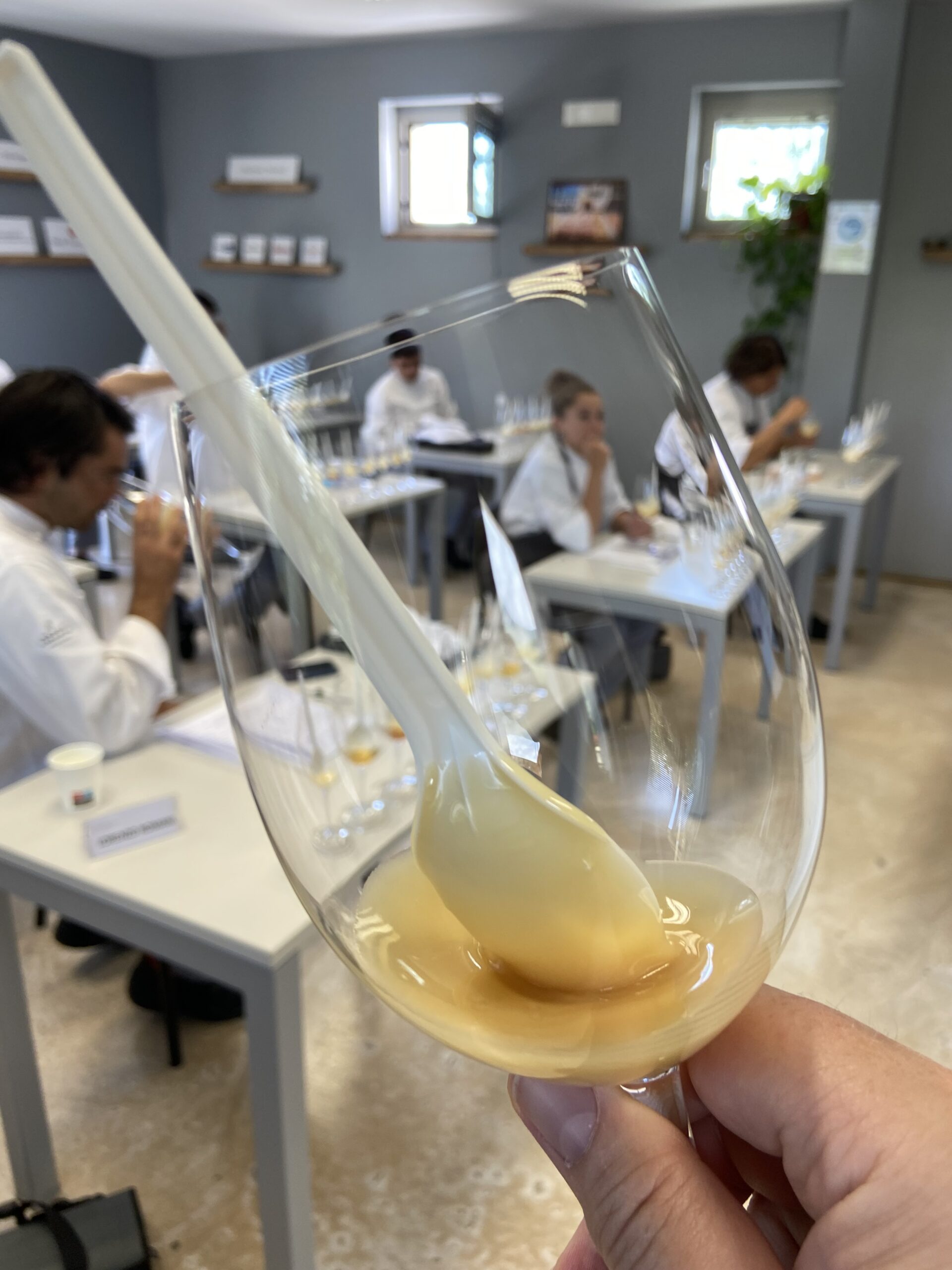 Raccontare il miele dalla parte delle api è la caratteristica che contraddistingue il fascino delle lezioni che l’azienda Mieli Thun da anni svolge all’Accademia. E per suggellare la fine della giornata di lavoro, Francesca Paternoster ha dedicato un brindisi a tutti gli allievi del 17° Corso con una bottiglia di Idromele, una bevanda nata quasi per caso a seguito della ricca produzione di aceto di miele avviata dal padre nel 2003. «Una bevanda sperimentale a doppia fermentazione», spiega Francesca: «la prima con acqua e miele fermentati per tre mesi in botti di rovere, la seconda con lieviti in bottiglia. Il risultato? Non è un vino da dolce, ma una bevanda che ricorda il miele, con belle note profumate da usare anche come aperitivo». A salutare Francesca Paternoster anche lo chef Niko Romito.
