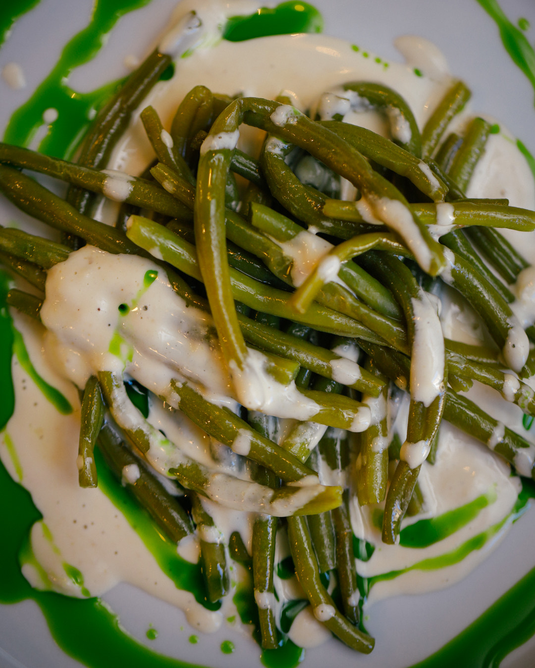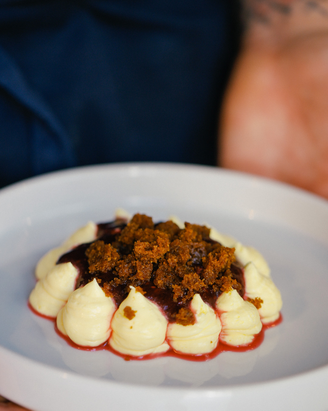 E il menù di Francesco Barra si caratterizza subito per la sua forte identità territoriale. «Uno dei piatti forti è agnello fritto e lime, mentre per i primi ho il ragù di cortile fatto con il brodo delle carni di coniglio, faraona e pollo tagliate al coltello, oppure lo spaghettone mantecato con burro francese e tartufo», spiega Francesco. «Un altro piatto che nasce dall’aia è il pollo con i peperoni: io uso il galletto, che viene laccato con un estratto di peperoni». Funghi, verdure e dolci fatti in cucina con ingredienti di stagione (come il Cremoso al mascarpone, coulis di lamponi e crumble di ciambella sorana) completano una proposta essenziale e solo in apparenza semplice.