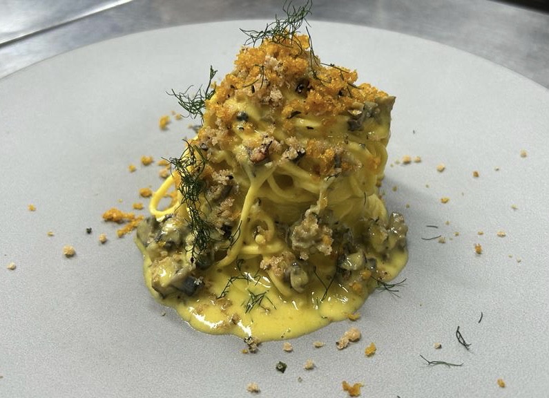 - Carbonara di lumache, pane croccante, bottarga di muggine e finocchietto selvatico