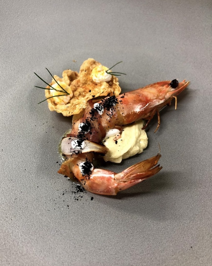 - Mazzancolla alla brace con spuma di scalogno, robiola di capra e porro bruciato