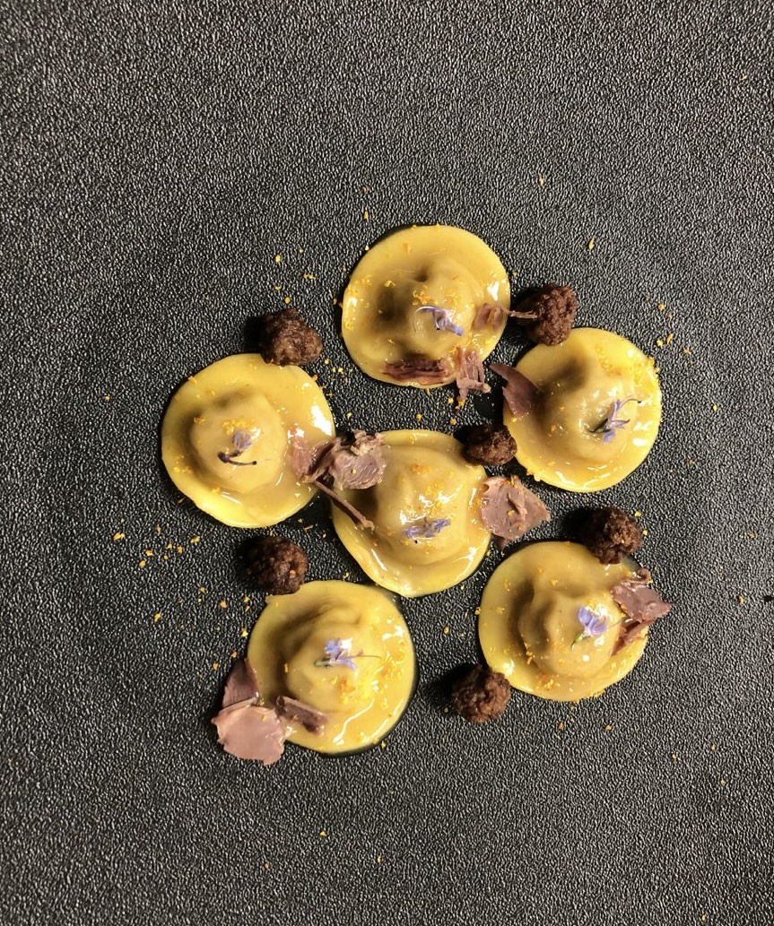 - Tortelli di picione, salvia, arancia e prosciutto di fegato di piccione