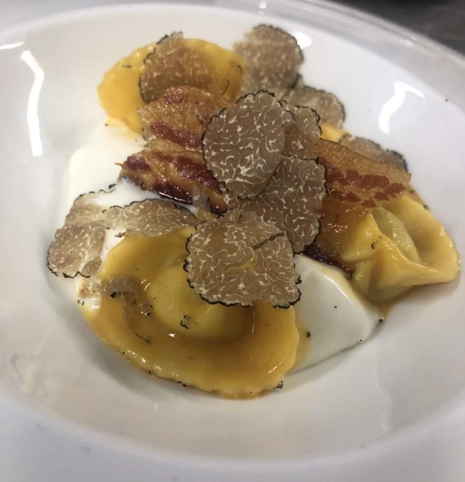 - Tortello di zucca tardiva, tartufo nero estivo, guanciale croccante e spuma al parmigiano